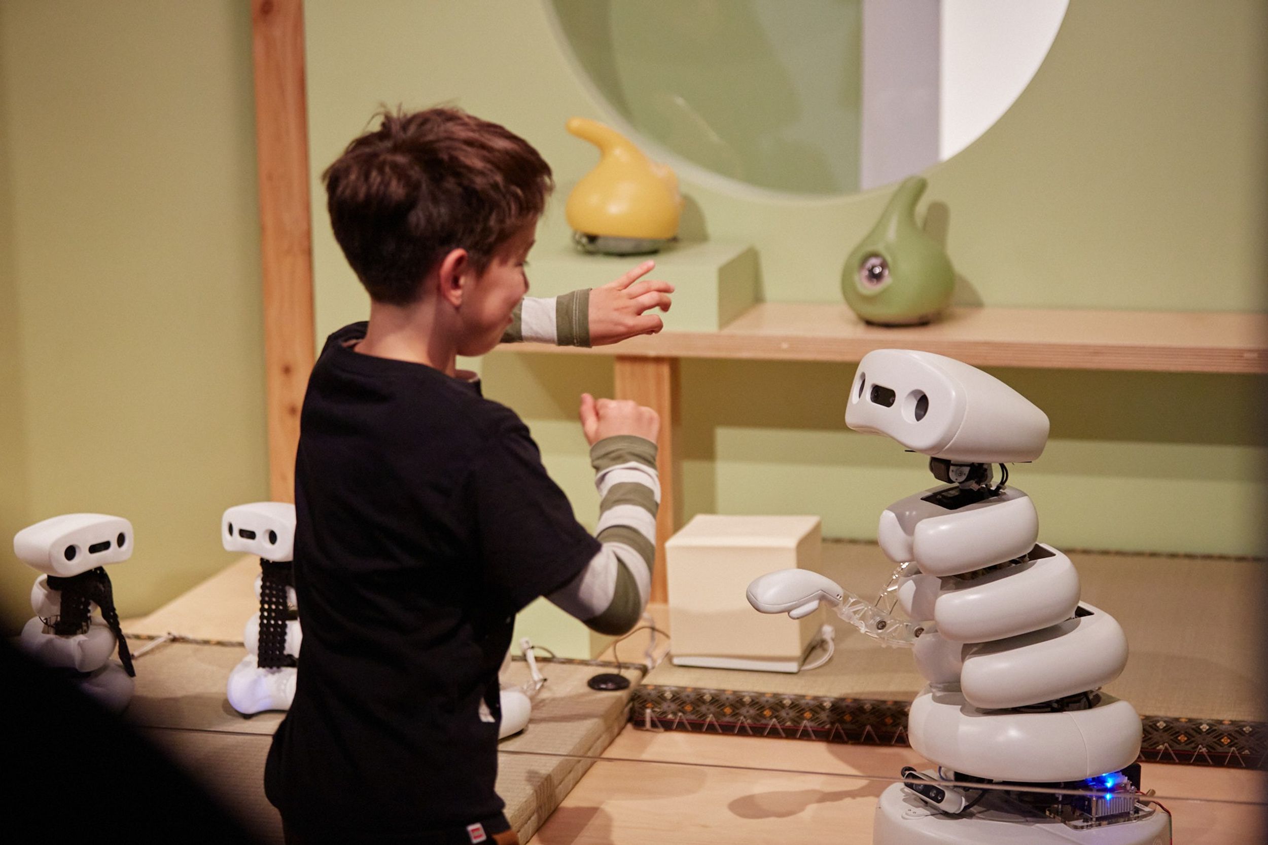Child interacts with Weak Robots by ICD LAB, FRIEND, 2026. Photo by Casey Horsfield.