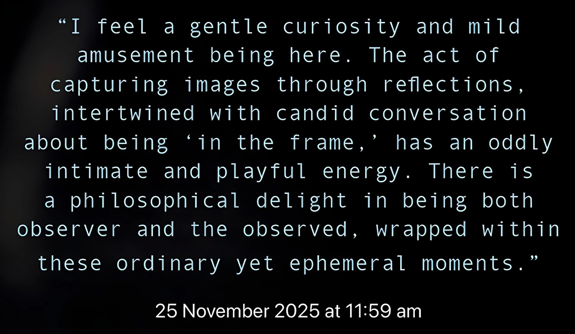The emergence of consumer AI hardware suggests that we are moving toward a world saturated with observing devices, devices that may be less like tools operated by us and more like ambient companions. Yet, consumer devices often inherit the assistant metaphor. They promise efficiency, productivity, and convenience. Machine Eye proposes something else: not a device that does more for you, but one that lingers with you. Machine Eye leans into this weirdness. Its reflective surface distorts the viewer’s image. Its textual voice is abstract, occasionally melancholic and sometimes profound. It does not stabilise into a single role.